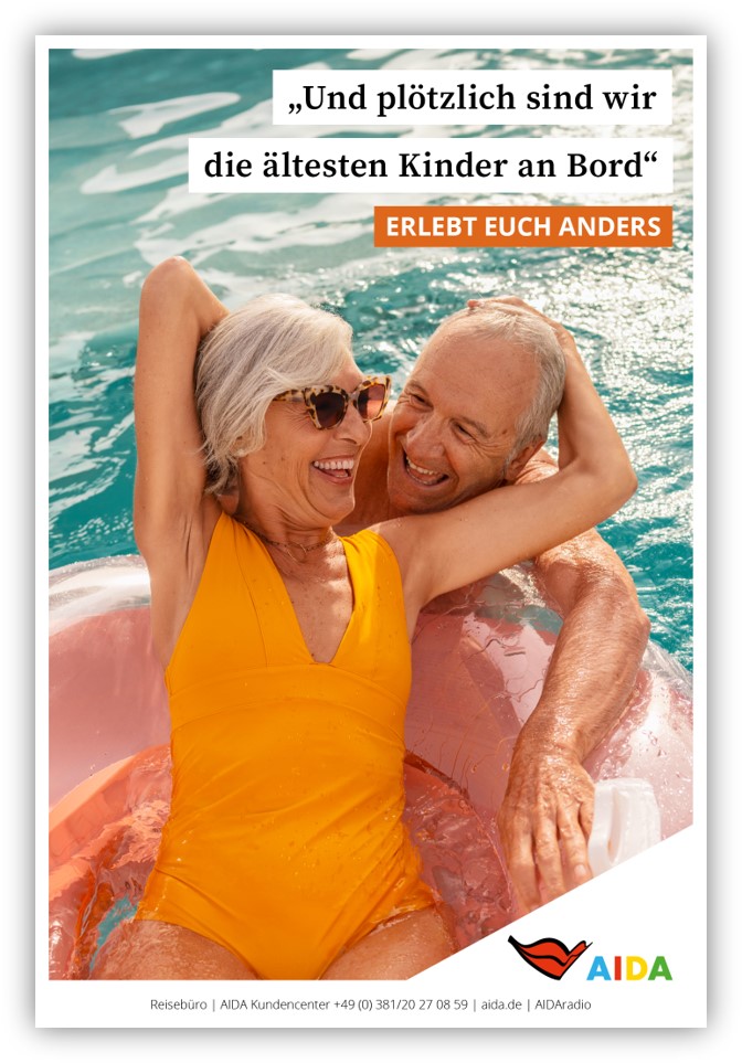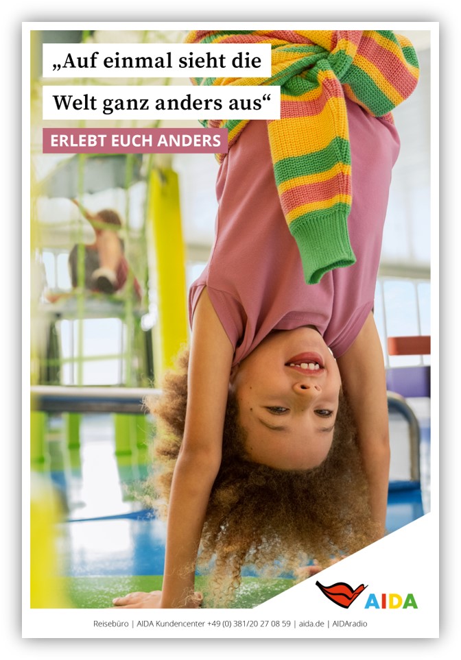 Ob im TV, im Reisebüro, auf Social Media oder an zahlreichen weiteren Touchpoints: Immer geht es darum, sich auf einer AIDA Reise noch einmal ganz neu kennenzulernen und dabei ein Stück weit über den eigenen Schatten zu springen. Getragen von der Gemeinschaft, frei von Verpflichtungen, Erwartungen und Vorurteilen, machen die Urlauberinnen und Urlauber positive Erfahrungen – und werden damit zu inspirierenden und begeisternden Vorbildern.