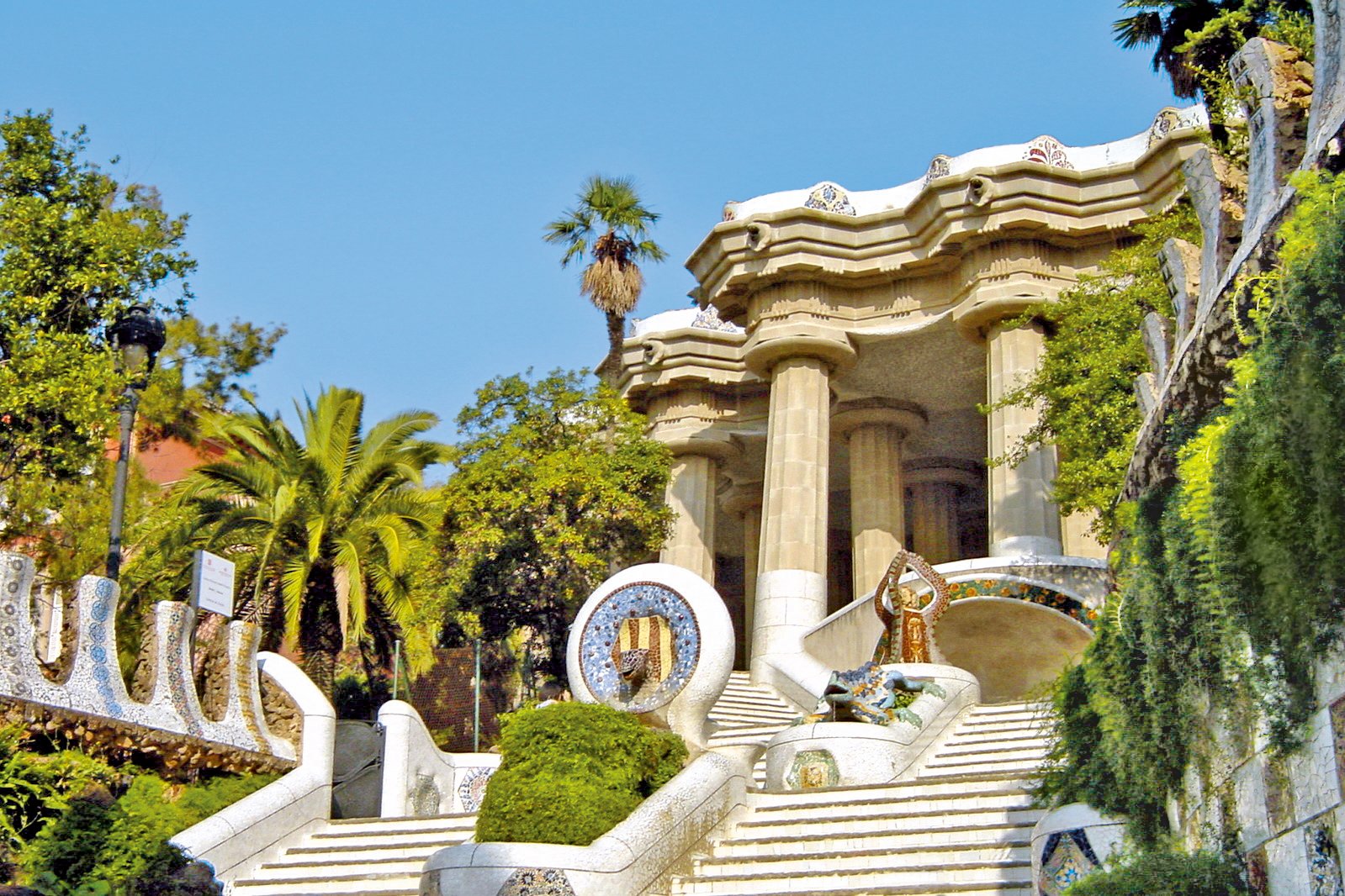 Schimmernde Mosaikfassaden und eine Salamander-Fontäne begrüßen Sie auf dem Weg zur römisch-säulengefassten Plaza. Von der bunten Balustrade bietet sich ein Blick über die Stadt. Auf der glänzenden Mosaikbank genießen Sie die Aussicht auf Gaudís Häuser.