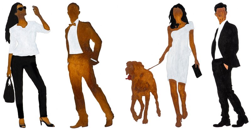 In scherenschnittartigen Umrissen und oxidierender Farbigkeit werden in Echtrostmalerei und Mischtechnik Menschen aus seiner Umgebung ohne Mimik in posierender Haltung und Gestik dargestellt und typische und aussagekräftige Positionen herausdestilliert.