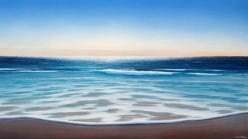 Betrachtet man die „Bilder vom Meer“ von Michael Weigel, so spürt und fühlt man seine Faszination und seine Passion für Himmel und Meer. Die meisten Bilder entstehen im Atelier direkt am Strand von Scharbeutz-Haffkrug, einen Steinwurf von der Wasserkante entfernt. Dabei geht es dem Künstler nicht um die naturgetreue Abbildung bestimmter Orte. Vielmehr sind die Bilder Kompositionen, für die Michael Weigel rund um den Globus das Meer studiert hat.