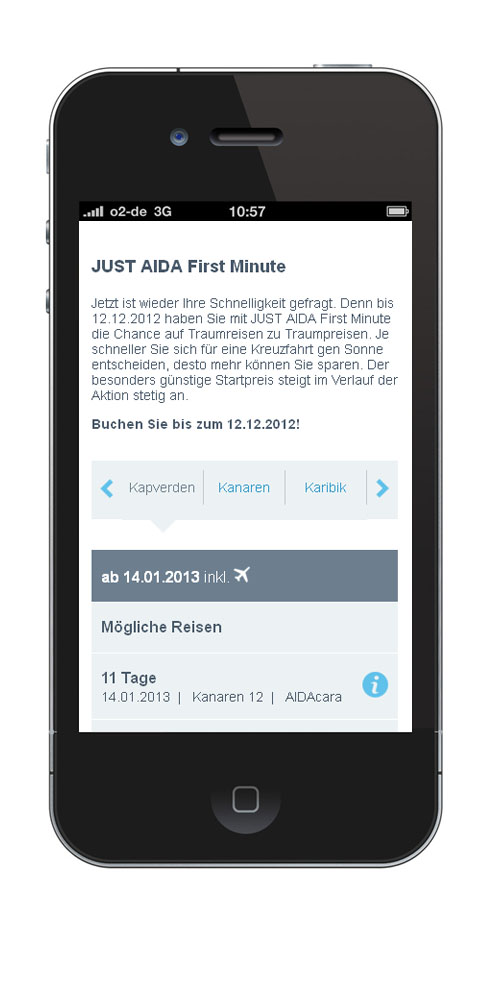 Bleiben Sie bestens informiert: Mit dem AIDA Mobilportal sehen Sie stets die aktuellsten Kreuzfahrtangebote, z. B. JUST AIDA First Minute - unsere Aktion für Schnäppchenjäger. Oder suchen Sie in unserem Online-Katalag aus mehr als 600 Kreuzfahrten nach Ihrer Traumreise zu Ihrem Wunschtermin.